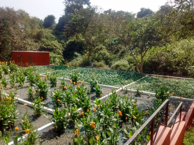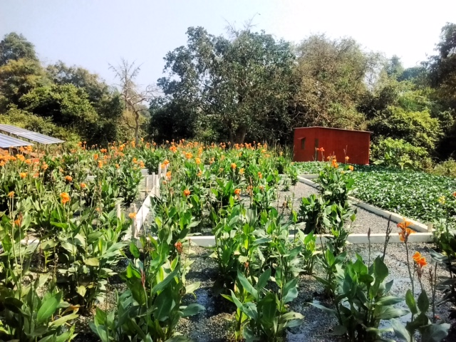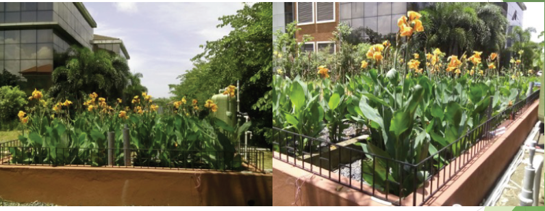 Tertiary biological Wetland Cell(TBWC) : It consists of layer of gravel/stones/pebbles and layer of mud with plants planted like Elephant grass(Pennisetum purpurem), Cattails (Typha Spp.),Reeds(phragmites Spp.), Cannas pp.,Yellow flag iris(iris pseudocorus) that are normally found in natural wetlands with filtration and treatment capability. Furthermore some ornamental as well as flowering plants species such as Golden Dhuranda, Bamboo, Nerium, colosia etc. can be used for treatment.