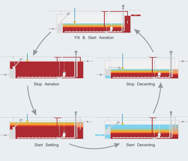 The complete biological operation is divided into cycles. Each cycle is of 3 – 5 hrs duration, during which all treatment steps take place.