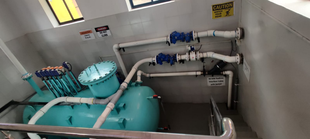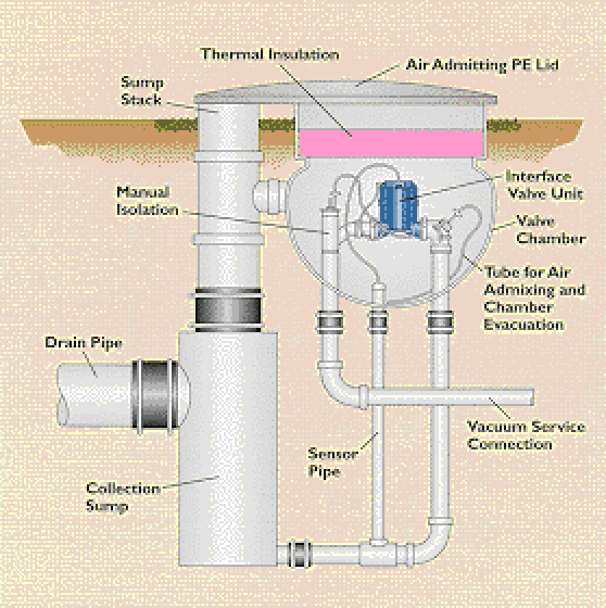 Vaccum Sewer system is useful in areas where topography is not uniform. In this Sewer lines are laid at a depth of 1.2 metres. The basic concept this technology is Air based transport of liquids (2 phase flow).