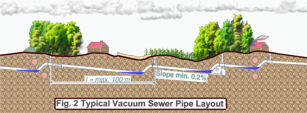 Negetive pressure is maintained in line with creation of waste water pockets. Manholes are not required in this system. In vaccum sewer systems sewer lines are self cleansing due to high velocity and pressure maintained in the lines. Vaccum sewer lines are laid in Saw Tooth Profile with minimum slope of 0.2% for maximum length of 100 mts. as shown in Fig. 2. Hence excavation of deep trenches as required for gravity sewers are eliminated with this system.